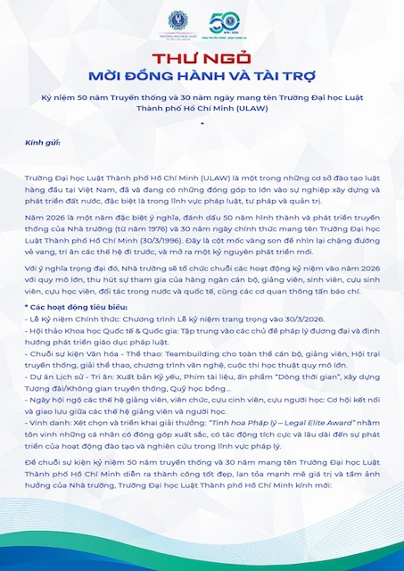 Trường Đại học Luật TP.HCM triển khai chuỗi chương trình hướng tới cột mốc 50 năm truyền thống (1976-2026) và 30 năm ngày mang tên Trường (30/03/1996-30/03/2026), kết nối truyền thống và tầm nhìn phát triển bền vững.